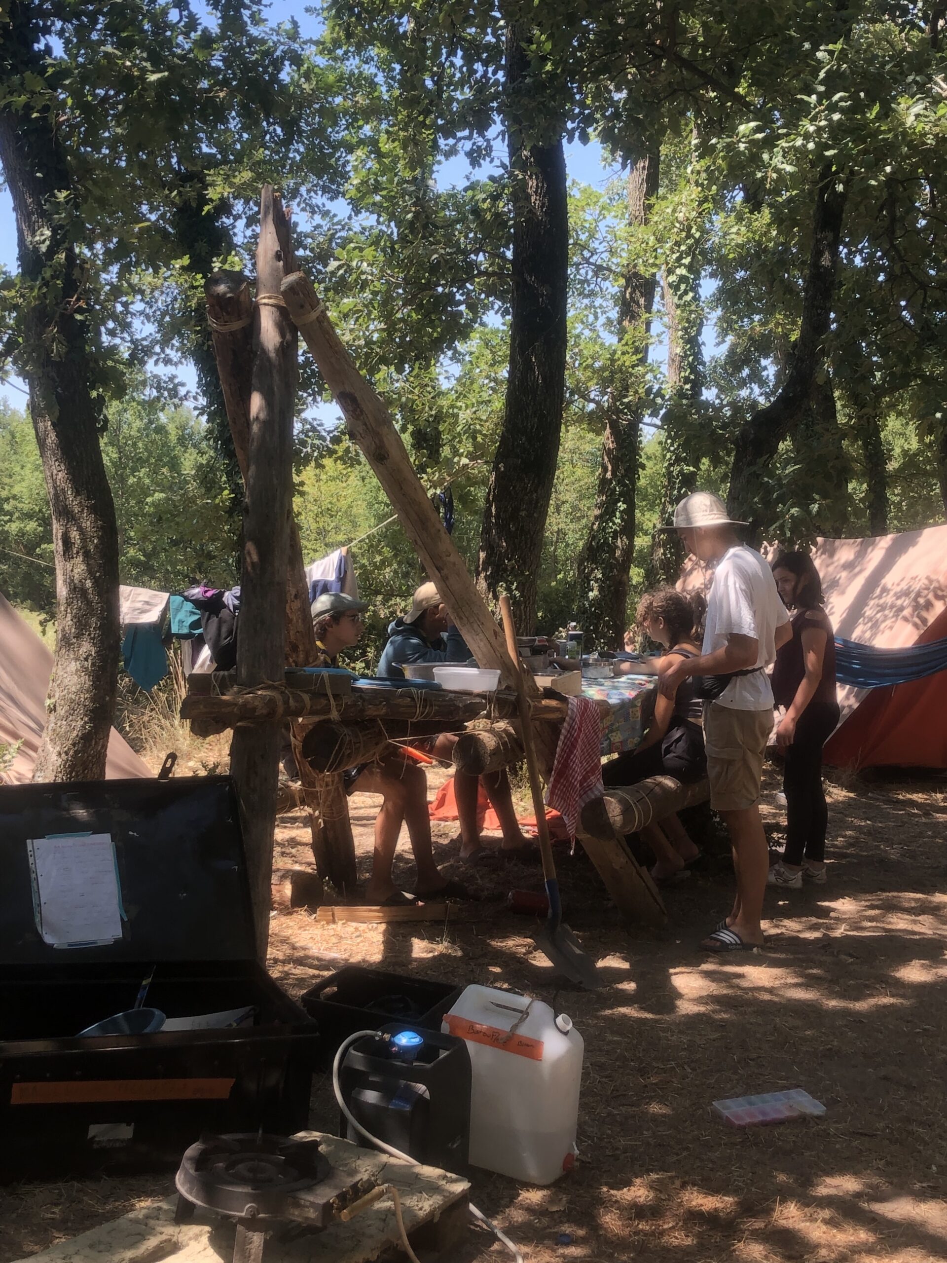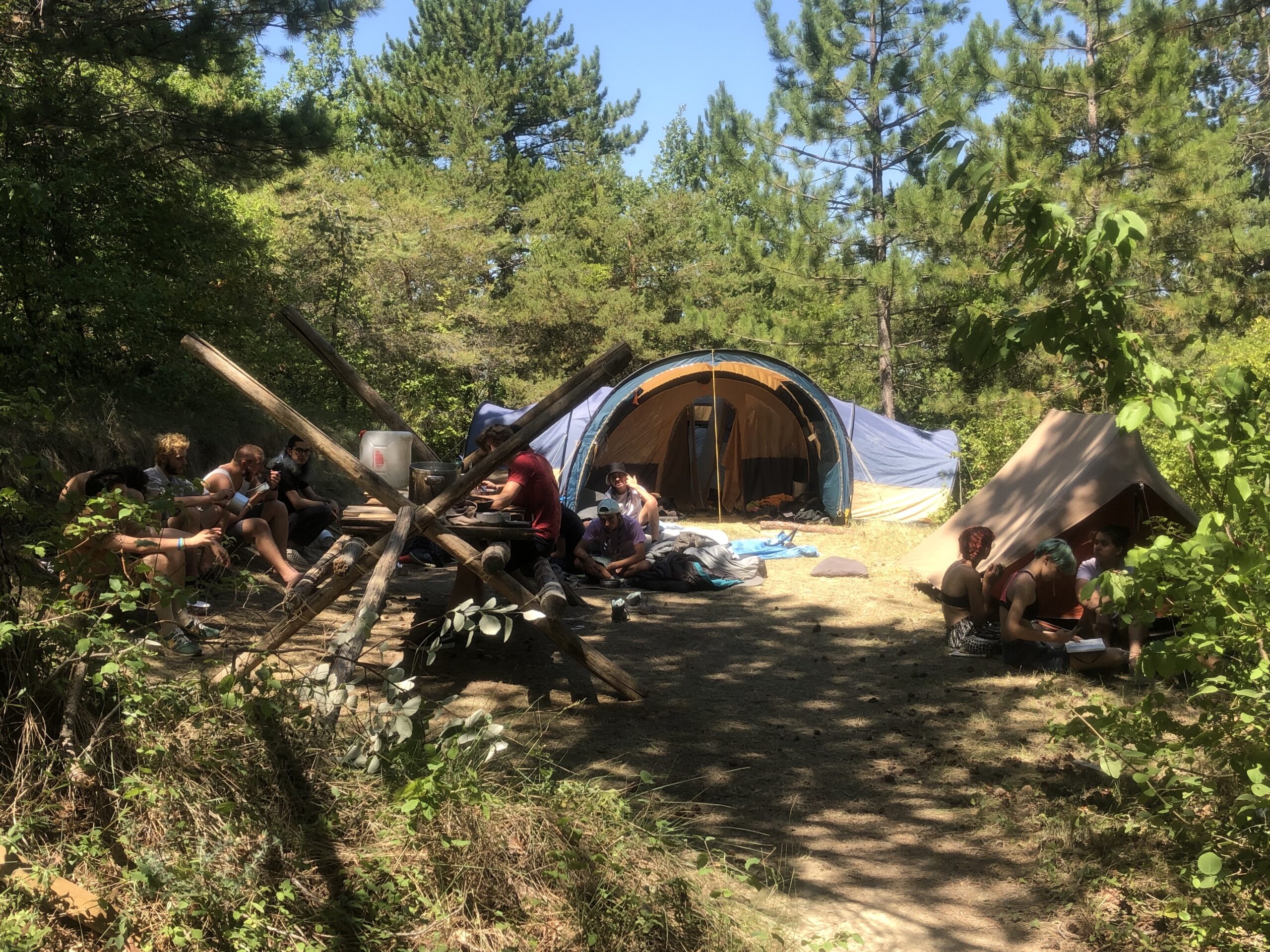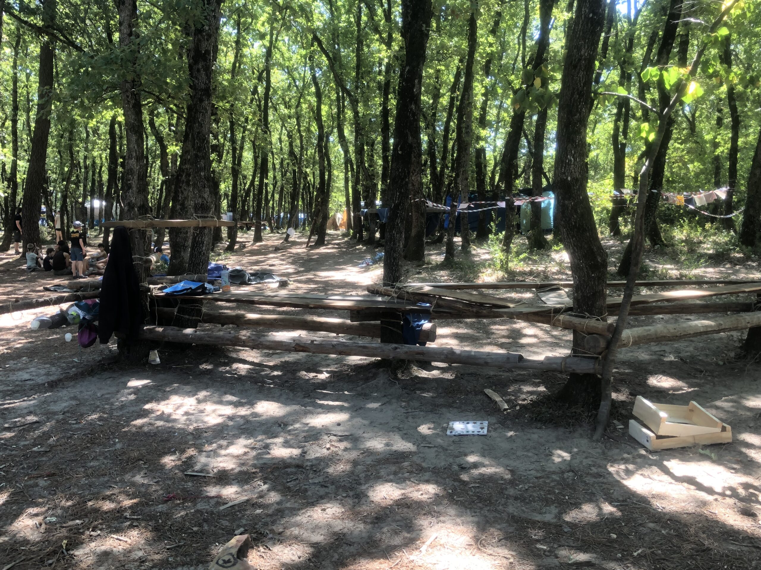 Il y a entre autres le montage des toilettes sèches, construction du vaisselier des loulous, arrivée des marseillais, 1er repas des éclés (pâtes bolognaises), les bancs sont encore à construire.