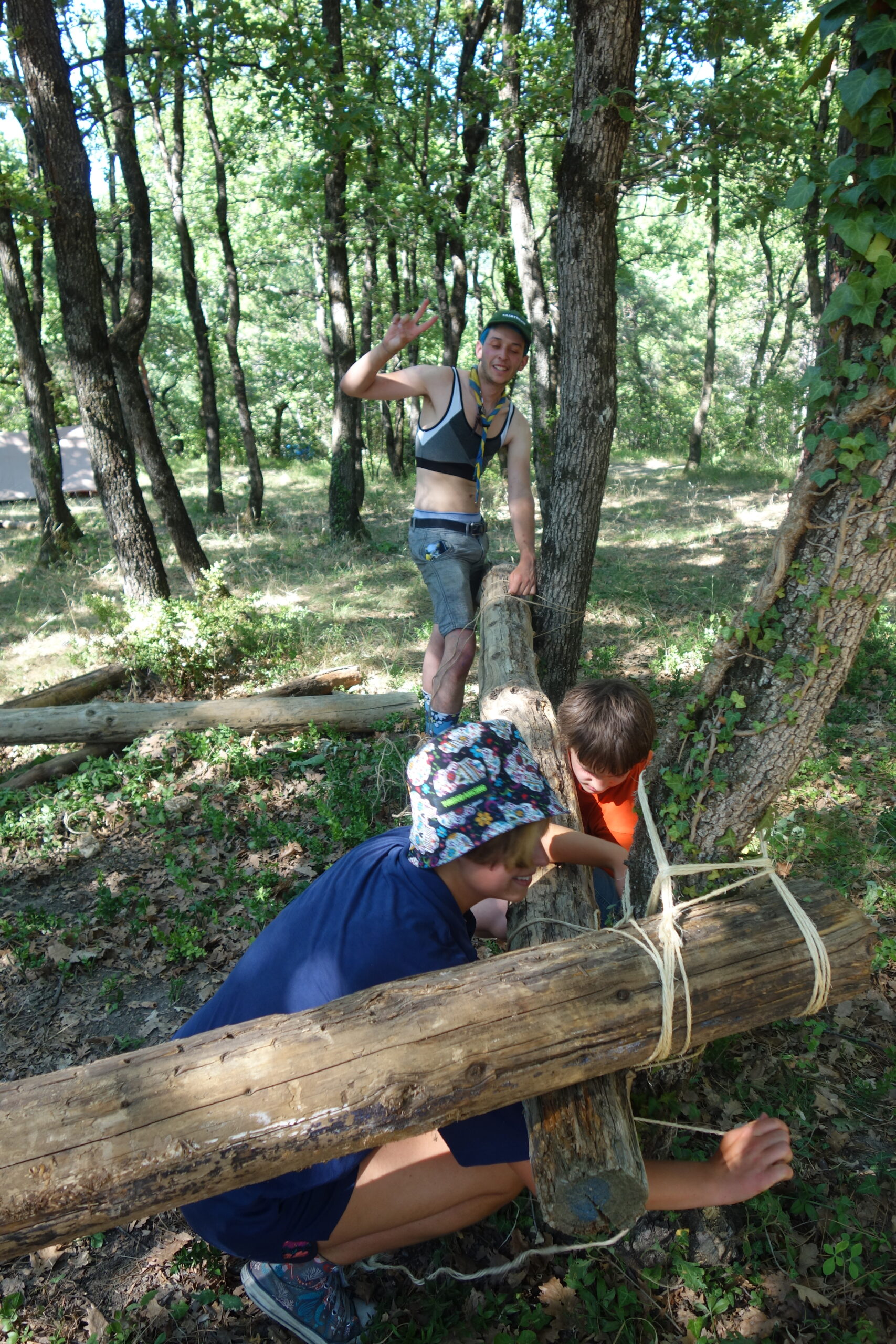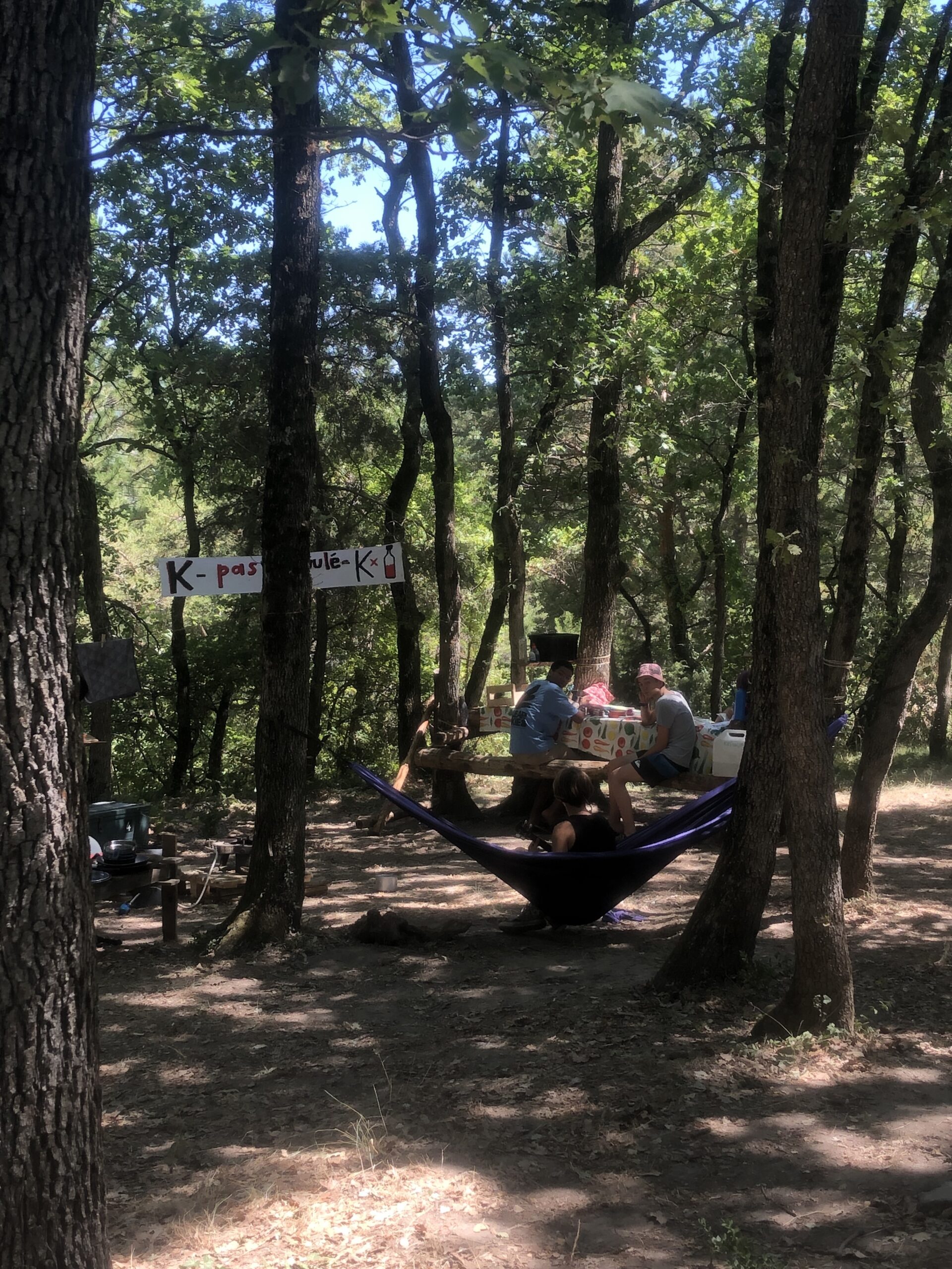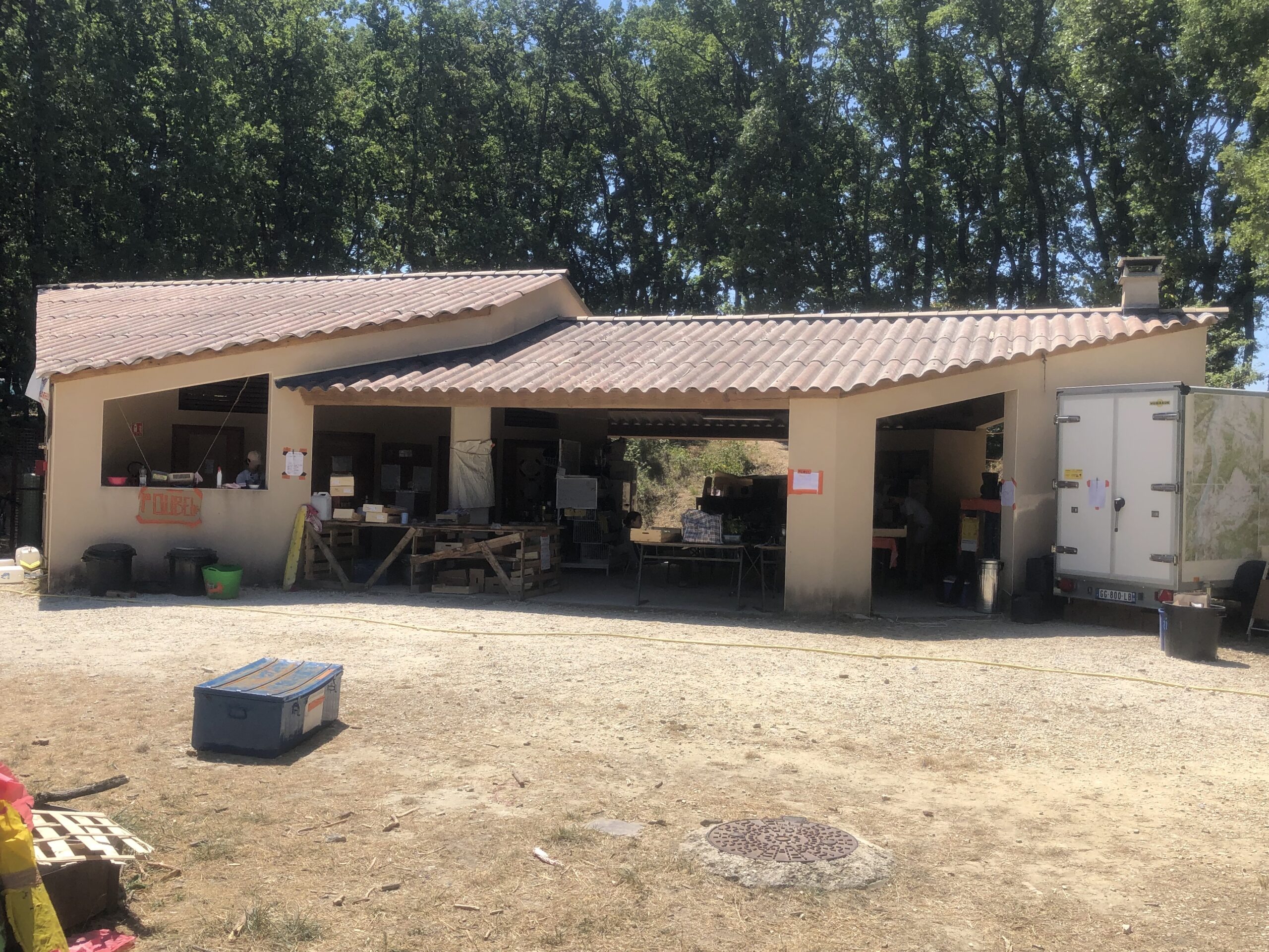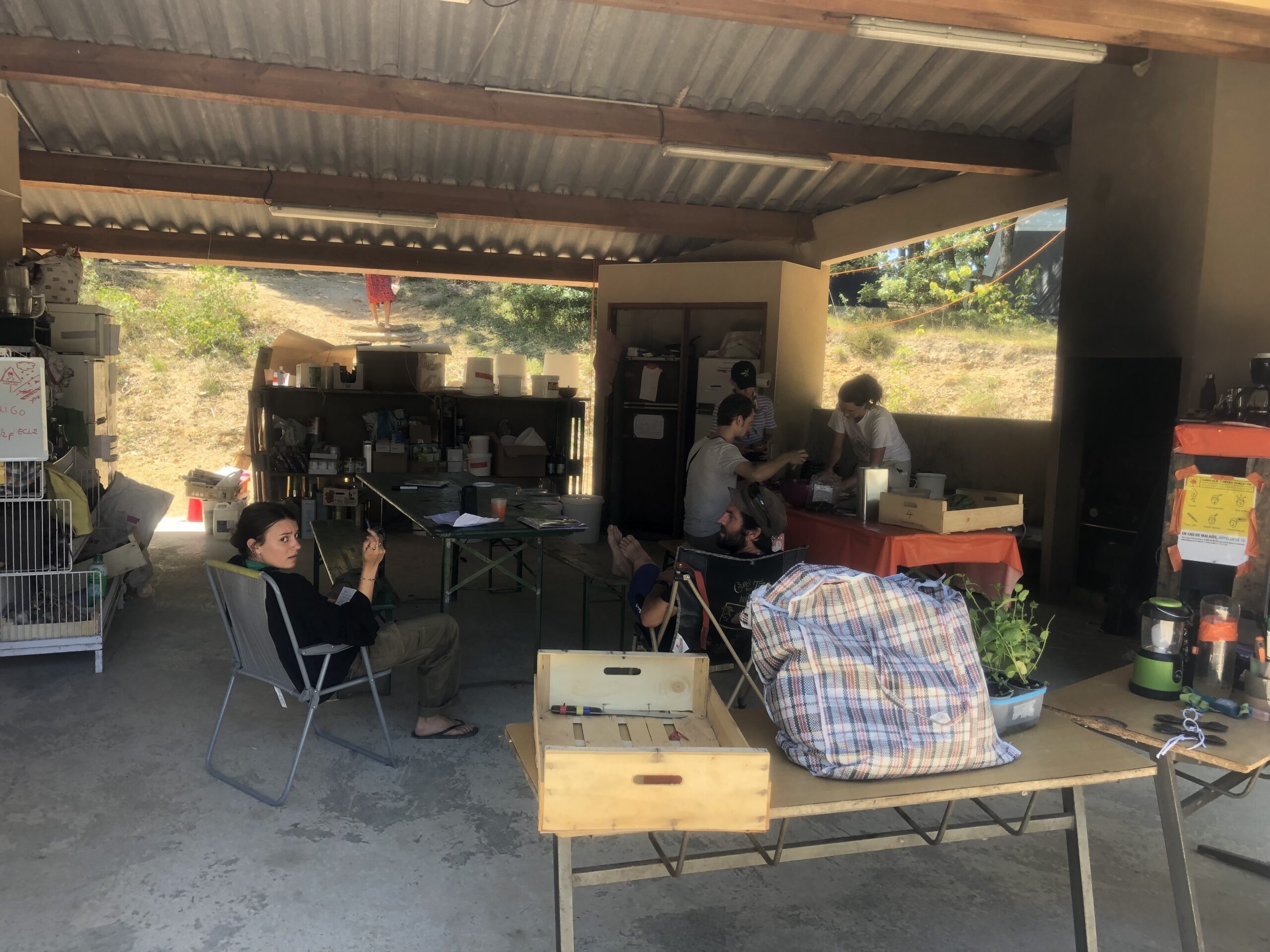 Il y a entre autres le montage des toilettes sèches, construction du vaisselier des loulous, arrivée des marseillais, 1er repas des éclés (pâtes bolognaises), les bancs sont encore à construire.